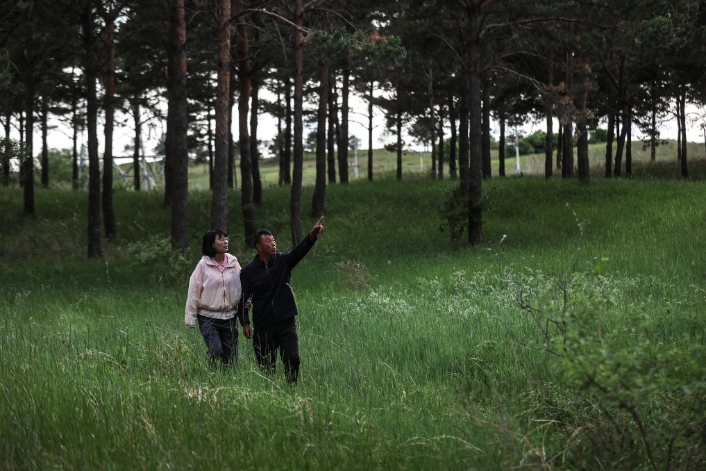 6月3日,李明明下班后来到林场,与父亲李东魁一起在林间散步。新华社记者潘昱龙摄