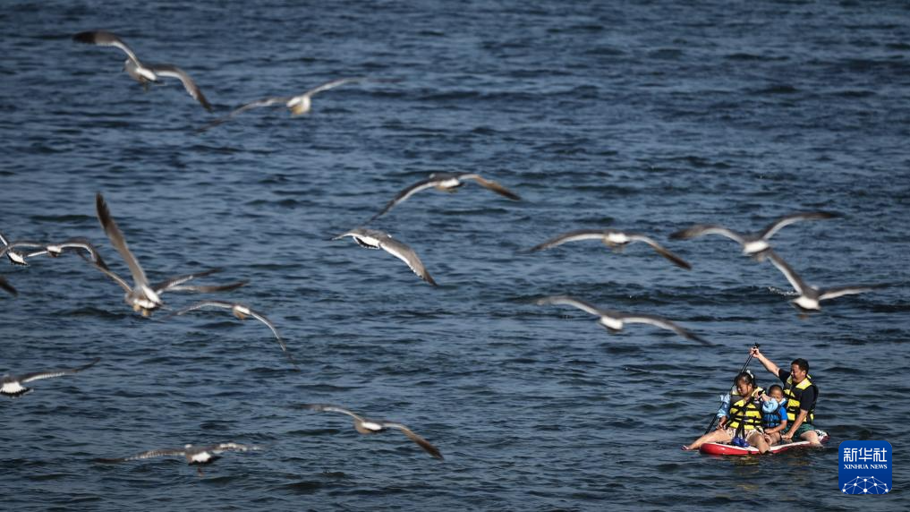7月10日,游客在大连傅家庄公园海滨沙滩投喂海鸥。