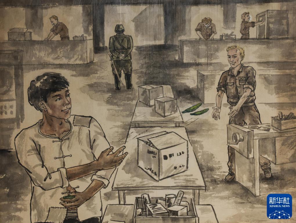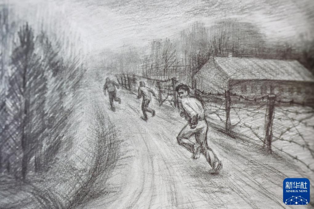 沈阳二战盟军战俘营旧址陈列馆内展出的绘画作品(翻拍照片)。
