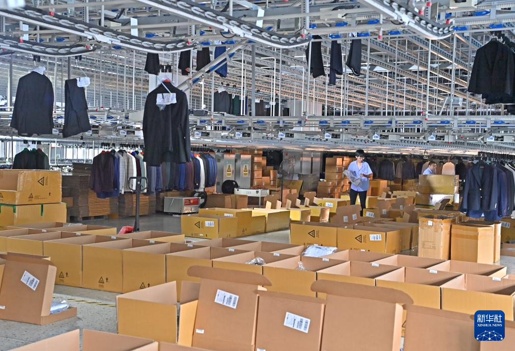 这是8月28日拍摄的辽宁省大连市大杨集团的西服生产车间。大杨集团运用数智化技术,实现定制西服批量化生产。