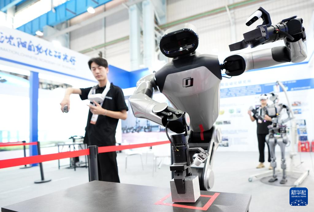 9月5日,在沈阳举行的2025全球工业互联网大会的展览区现场,中国科学院沈阳自动化研究所的机器人工程师在调试具身智能操作系统。新华社记者 李钢 摄